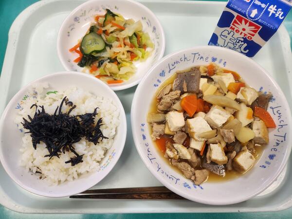 ごはん ひじきふりかけ 筑前煮 わかめサラダ 牛乳