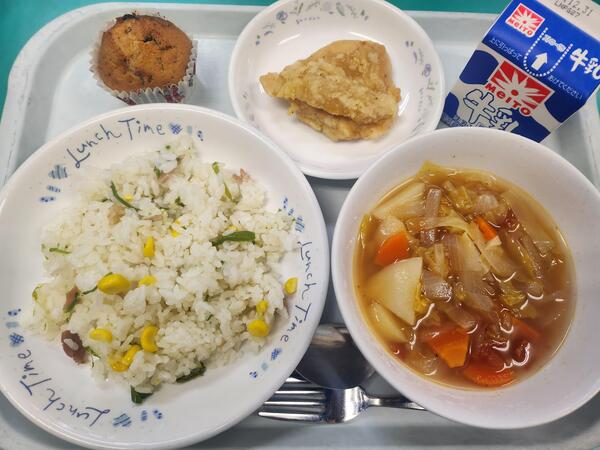 コーンピラフ フライドチキン ミネストローネ チョコチップマフィン 牛乳