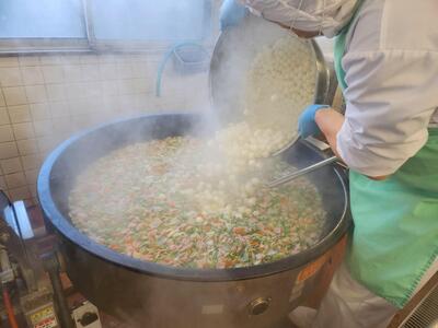 七草白玉雑煮 調理中の様子です。ボイルした白玉だんごを加えています。