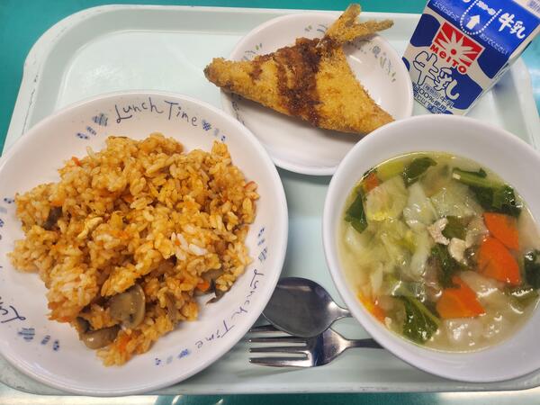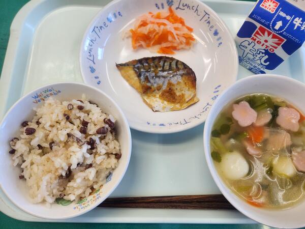赤飯 魚の香味焼き 紅白なます 七草白玉雑煮 牛乳