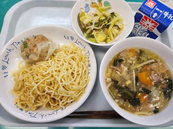 広東めん シュウマイ 茎わかめのナムル 牛乳