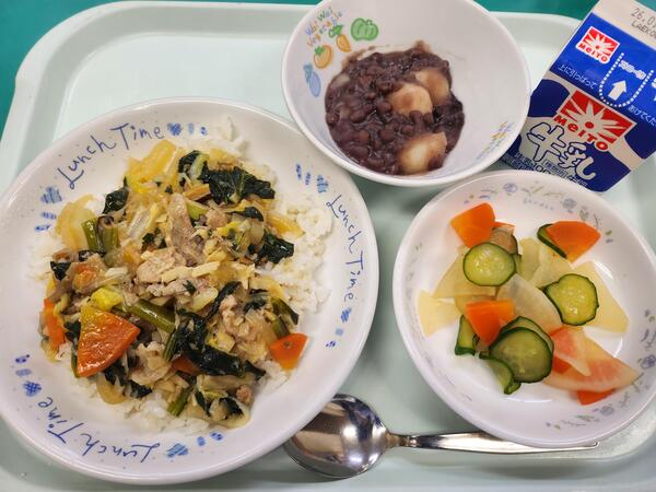 うま煮丼 だいこんのピリ辛 白玉ぜんざい 牛乳