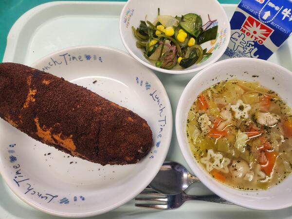 ココア揚げパン 星のパスタ入りチキンスープ 海藻サラダ 牛乳
