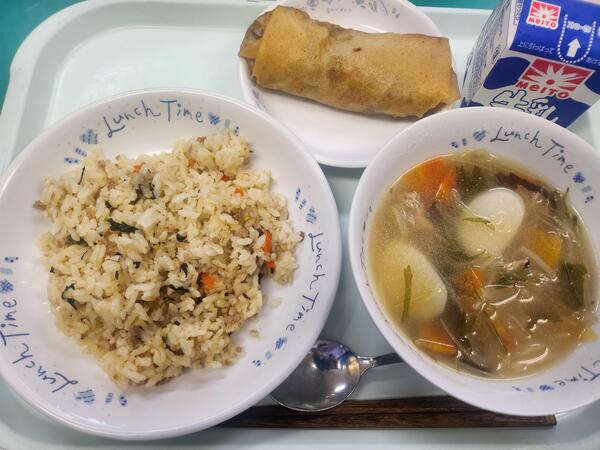 小松菜チャーハン れんこん入り春巻き トックスープ 牛乳