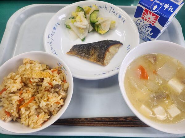 しょうが入り炊き込みごはん ホッケの塩焼き かぶのサラダ 粕汁 牛乳