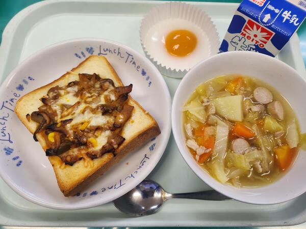 ピザトースト ポトフ おかしな目玉焼き 牛乳