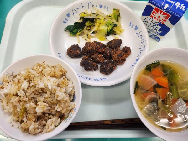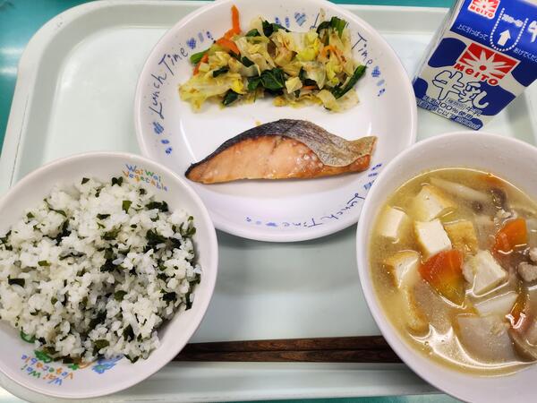 今日の給食では、大寒にちなんで、からだがあたたまるしょうがを使った炊き込みごはんと味噌・酒粕を使用した「粕汁」を提供しました。寒い日にぴったりの献立に、子どもたちも喜んでくれました。