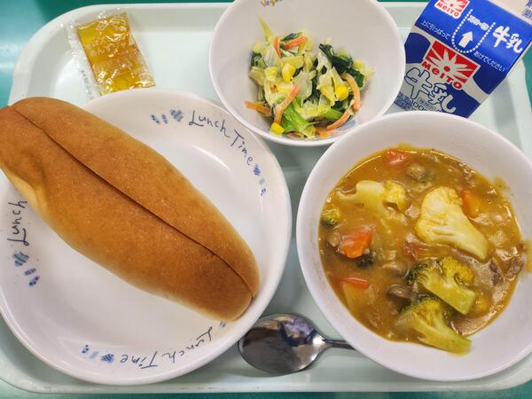 コッペパン あんずジャム ブラウンシチュー 小松菜のマヨ和え 牛乳