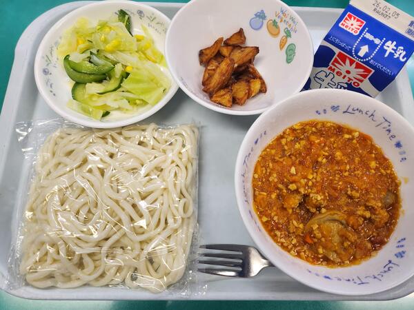 ソフト麺 ミートソース フライドポテト キャベツとコーンのサラダ 牛乳