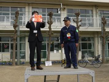1年生は既にランドセルに付けているさかえちゃんハンカチですが、2年生以上の子供たちへの贈呈式、そしてこれに合わせて、さかえちゃん事務局の方々が朝礼でさかえちゃんの紹介とグッズの紹介をしてくれました。子供たちに人気のさかえちゃん、ますます人気が出てきそうです。