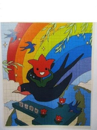 栄小地域安全連絡会アート担当の佐々木さんが考案した図案は、地域安全連絡会のマスコットであるチューリップの“さかえちゃん”が、つばめと一緒に地域を見守るデザイン画となっています。眼下には栄小学校の校舎と地球が広がっており、無限の可能性を秘めた未来の大きさを表し、虹が祝福し応援してくれています。