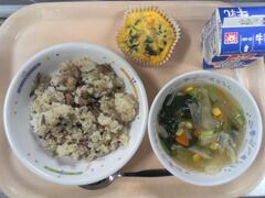 今日は体力テストに合わせて、鉄分とビタミン補給を意識した献立です。大豆やひじき、海藻、みかんなど、運動に必要な鉄分と鉄分の吸収に必要なビタミンが取れるメニューになっています。