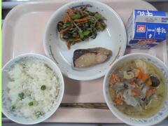 グリンピースごはんのグリンピースは、1時間目に 1年生が 学校を代表して「さや」から上手に出してくれました。さやから出したばかりの新鮮なグリンピースは、いつもより甘くて、やわらかく、おいしいです。グリンピースは、さやから出してすぐが一番おいしいので、「旬」の今しか 生のおいしいグリンピースは食べられません。