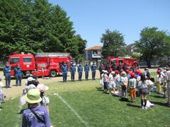 芝久保小学校に消防車が来てくれました。2台の大きな消防車を目の前に、画用紙いっぱいにクレヨンで絵を描きました。とても良いお天気の中、楽しい「写生会」になりました。