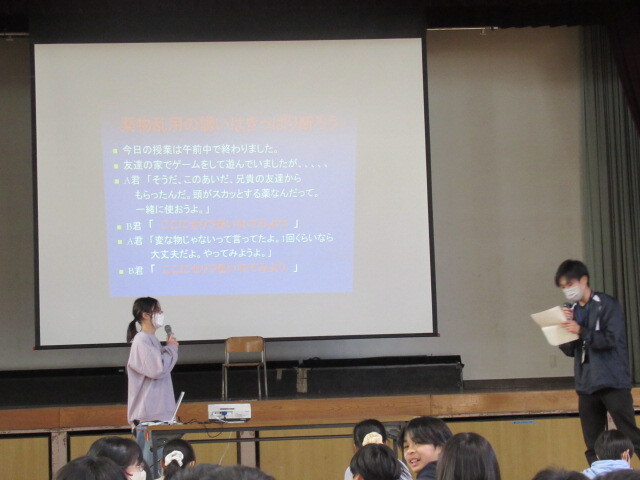 もしも薬物使用の勧誘に巻き込まれた時にどう断るか、自分なりの答えを考えて発表しました。