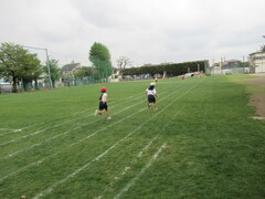 1組と2組合同で、走の運動遊びを行いました。ホースを目印に、真っ直ぐ走る感覚をつかみながら、元気いっぱい走りました。