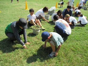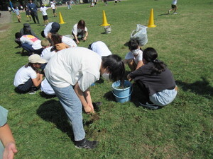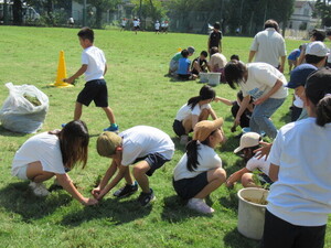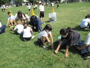 校庭の芝生の雑草抜きをしました。