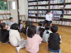 読書月間中に図書委員が、読み聞かせをしてくれています。期間中に4回、低学年にむけて図書室で読み聞かせを実施しています。