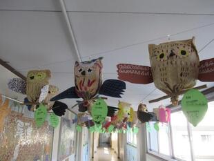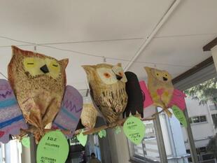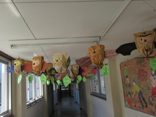2階の渡り廊下に、1年生が製作した「ふくろう」の作品が飾られています。クラフト封筒を使って本体を作り、羽、口ばしなどはデザインを工夫して完成させました。廊下が明るい雰囲気になり、とても素敵です!