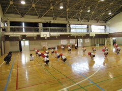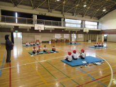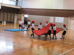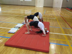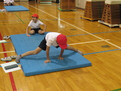 マットを使って、転がる運動あそびをしました。先生の話をしっかり聞いて「背中倒立」「ブリッジ」「川跳び」にチャレンジしました。