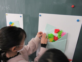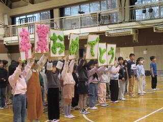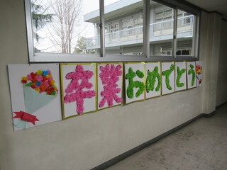 6年生へ感謝の気持ちを込めて、お花でメッセージを作りました。2クラスとも閉鎖しており、短い準備期間でしたが、当日の出し物も堂々と発表できました。メッセージは、6年生の教室に近い、3階長廊下に飾りました。