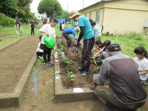 生活科で野菜の苗植えをしました。苗植え当日は、地域にお住いの野菜名人たちを5名お招きして、コツを教わりながら作業をすすめました。苗を優しく盛ったり、しっかりと土をかぶせたりと、名人のアドバイスをよく聞いて取り組みました。今後は立派に育った野菜を想像しながら、水やりや観察を行っていきます。