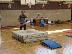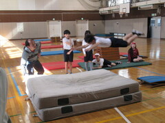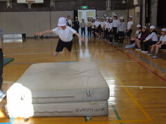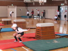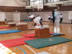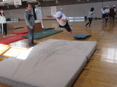 4年生は、体育で跳び箱運動をしています。開脚跳びで、腰を高く上げる感覚をつかむために、エバーマットに跳び込む練習をしました。子ども達は、楽しんでエバーマットに跳び込んでいました。