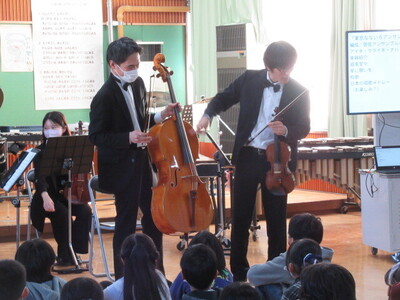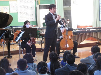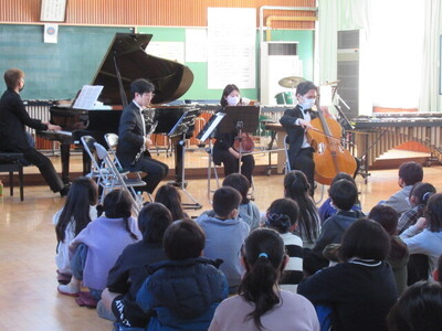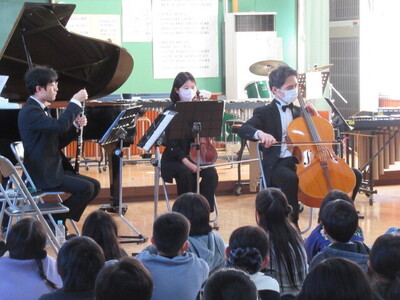 弦楽器・オーボエ・ピアノの編成によるアンサンブルの音色に児童は一生懸命耳を傾けていました。