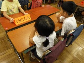 2年生国語『そうだんにのってください』の学習で、研究授業を行いました。本時の学習のねらいは、友達のそうだんに関心をもち、自分の考えを話すことで話をつなげることです。