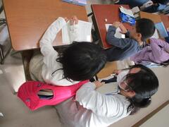 洪水の被害や、洪水に備える工夫にはどのようなものがあるのか、タブレットパソコンで調べ、スライドにまとめる学習をしていました。高学年になると、タブレットパソコンを自在に扱って、学習に役立てることができます。子どもたちは、図や写真を引用して、丁寧にまとめていました。