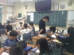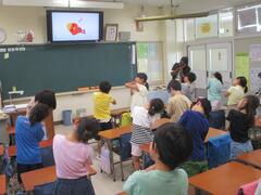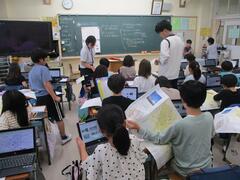 6年生が、外国語の授業をしていました。今日は、今年度新たに教えていただくALTの先生も一緒に、「英文で日本を紹介する」内容の学習でした。ALTの先生とコミュニケーションをとりながら、英語に慣れ親しむ体験的な活動をしていました。