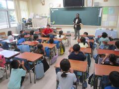 2年生が、外国語活動の授業をしていました。今日は、担任とALTの先生がテイーム・テイ―チングで、ジェスチャーや歌などを通して身体表現したり、「ジャンケンゲーム」などをしたりしていました。子ども相互のペアで言ったり聞いたり、全体でゲーム的な要素を取り入れて活動したり、楽しみながら英語に慣れ親しんでいました。