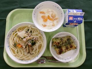 牛乳・肉うどん・竹輪の磯辺揚げ・フルーツヨーグルト
