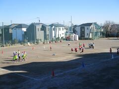 4年生が、校庭で体育の授業をしていました。今日は、「ゴール型ゲーム」領域の「ラインサッカー」の学習でした。チーム別の練習をした後、ゲームをしていました。寒い中でも、元気に活動していました。