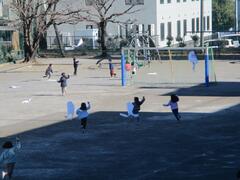 住吉小学校の校庭は校舎の北側にあるので、冬の間は校舎の影で半分近くが日陰になってしまいます。寒い日が続きますが、外で遊ぶことが大好きな子どもたちは、中休みになると鬼ごっこをしたり、ボール遊びをしたりして、校庭で元気一杯体を動かしています。今日もよいお天気だったので、高学年はサッカーやドッチボールを楽しんでいました。2年生は昔遊び体験で、竹馬を始めました。バランス感覚がよくて、あっという間に両足で乗れるようになっています。みんなとても楽しそうに取り組んでいました。