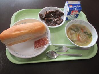 今週の給食は、全国学校給食週間として、「タイムスリップ給食」を実施しています。今日の献立は「コッペパン、イチゴジャム、鯨の竜田揚げ、ワンタンスープ、牛乳」でした。1月18日付の「給食だより第11号」でもお伝えしているとおり、栄養士や調理員の皆さんが、工夫しながら給食を提供していただいていることに、あらためて感謝申し上げます。