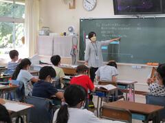 3年生が、外国語活動の授業をしていました。今日は、特別講師の先生が教えてくださる授業でした。好きな色や食べ物、教科などを尋ねたり答えたりする学習でした。講師の先生のテンポの良い授業に、子どもたちも引き寄せられて生き生きと活動していました。