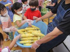 【6月24日】1年生と2年生が、トウモロコシの皮むきをしていました。