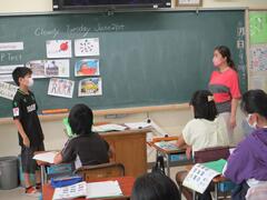 6年生が、外国語の授業をしていました。今日は、ALTの先生も一緒に、「西東京市のことを紹介する」内容の学習でした。友達相互で、また、ALTの先生とペアになって紹介し合いながら、英語に慣れ親しむ体験的な活動をしていました。
