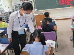 1年生の国語は、ひらがなの学習が進んでいます。ひらがなは一画で書く文字から学び、今日は「せ」の書き方を習いました。鉛筆をしっかり持って、形よく書いていました。学習したひらがなプリントはファイルに綴じます。プリントを穴に通し、プラスティックの留め具をスライドさせて綴じる作業は、1年生にはとても難しいのですが、手先を器用に使って、上手に片付けていました。