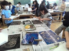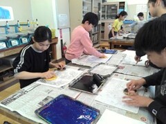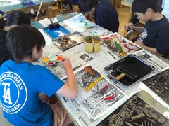 図工の学習で、木版画を制作しました。板に思い思いの模様を彫り、いよいよ刷りの工程へ。紙をめくった瞬間、「わあ、すごい!」と版が作品になる驚きと喜びの声で溢れていました。刷った紙は裏からえのぐで着彩し、カラフルに仕上げました。