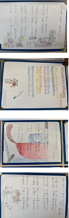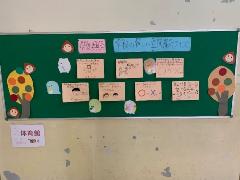 1年生の国語の学習では、「話すこと・聞くこと」の領域の学習で「ともだちのこと、しらせよう」という学習を行いました。対話を通して友達のことを知り、友達に紹介するクイズ作りを通してお互いに協力をする態度を育てました。友達に、いま「一番楽しいこと」について聞きました。そして、楽しいことについて詳しく書けるように、質問を考えました。聞いたことを落とさず、文章に書くことを頑張りました。これは、ある児童の文章の一部分ですが、『●●くんの一番楽しいことは、野球だそうです。何曜日にやっていますかと聞くと、土曜日にやっているんだそうです。どういう打ち方が得意かと聞くと、真っすぐ打つのが得意です。なぜ始めたんですかと聞くと、いい運動になるからだそうです。いつ始めたか聞くと・・・』(この後も続きます・・・)というように、とても上手に友達のことを紹介する文章が書けています。しっかりと力も付いています。