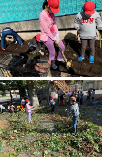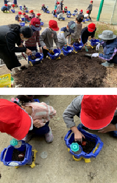 1年生が、チューリップの球根を植えていました。アサガオを育てるときに使用した鉢に花壇の土を入れて、球根を優しく植えていました。きれいな花が咲くのを想像しながら、笑顔で活動していました。