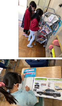 1年生が国語の学習で「じどう車ずかん」をつくっていました。教科書の説明文を読んで学習したことをもとに、図鑑で調べたことを絵と文章でまとめていました。「説明の順に気を付けて、分かりやすく書く」ことをめあてにして、活動していました。