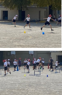 4年生がハードル走の学習を行っています。ハードルを調子よく走り越えるために、「1(いち)、2(にっ)、3(さーん)」のリズムでまずは、校庭の白線を「走り越える」練習を行っていました。中々リズムに乗れず、跳ぶことが難しそうです。担任が「〇〇さんうまい!!」とあったかい励ましと称賛の声をかけると、周りの子供たちも更に頑張り、根気よく練習に励む様子が見られました。