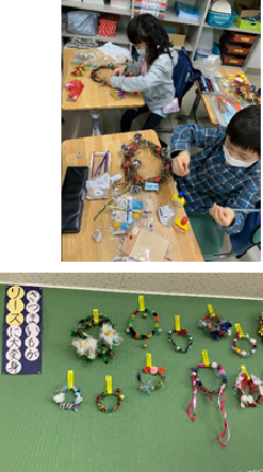 2年生が、丸くリースの形にしたサツマイモのつるに、飾り付けをしていました。自宅から持ってきた材料を、自分なりに工夫してきれいに仕上げていました。ご家庭で飾りの材料を準備していただき、ありがとうございました。