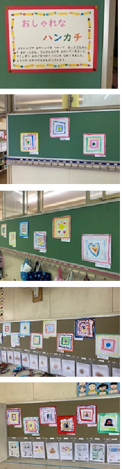 1年生が図工で「おしゃれなハンカチ」を描きました。教室前の説明書きには、次のことが書かれています。「太い筆や細い筆を使って、真っすぐな線や曲がった線、点線等を描いていました。少しずつ絵具を使うことにも慣れてきました。用具の片付けも頑張っています。」色合いも美しく、よく工夫がなされた作品がたくさんあります。1年生も、いよいよ「2年生に近い1年生」に成長してきました。道具の使い方も丁寧になりました。