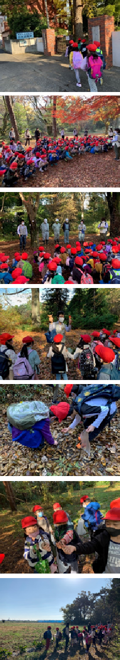 1年生は生活科の学習で、東京大学演習林田無試験地に行きました。入学して初めての校外学習なので、行き帰りの安全に気を付けることを第一のめあてにして学校を出発しました。演習林では、4グループに1名ずつ職員の方が案内・説明をしてくださいました。好天のもと、きれいに紅葉した林の中を散策しながら、木の実や葉、様々な種類の植物を観察することができました。「どんぐりや松ぼっくりを見つけたよ。」「もみじの葉が赤くなってきれいだな。」などと話しながら、秋の自然を堪能していました。