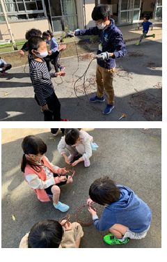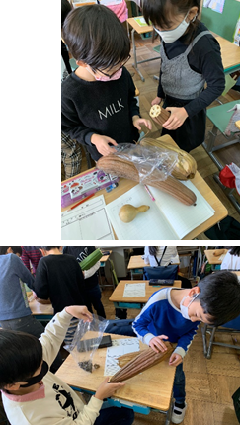 2年生が、生活科で育てたサツマイモの「つる」を使って、丸くリースの形を作っていました。1年生の時のアサガオのリース作りの経験を生かして、この後、様々な飾りを使って、素敵なリースに仕上げていく予定です。