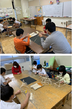 わかば学級高学年(4〜6年生)の子供たちが、図工の授業でピラミッドのオブジェを製作していました。割りばしと輪ゴムを使って、クラスごとに大きい作品を作るそうです。まずは、一人一人が作って、後に合体させていくようです。